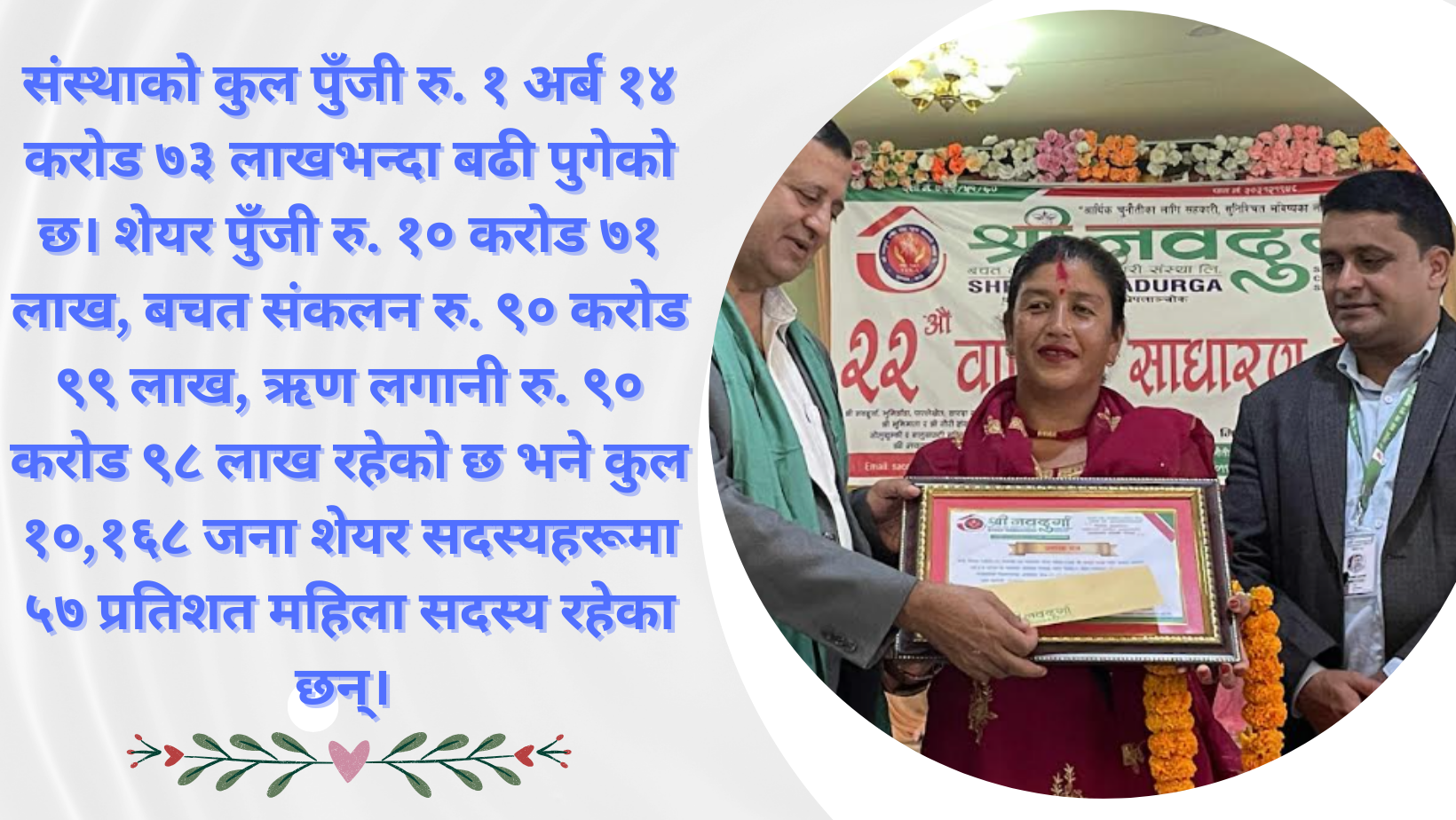 श्री नवदुर्गा बचत तथा ऋण सहकारी संस्था लिमिटेडले आफ्नो २२ औँ वार्षिक साधारण सभा भव्यताका साथ सम्पन्न गरेको छ। दुई चरणमा सम्पन्न भएको सभाको पहिलो चरण २०८२ साल भाद्र १४ गते विभिन्न सेवा... विस्तृतमा